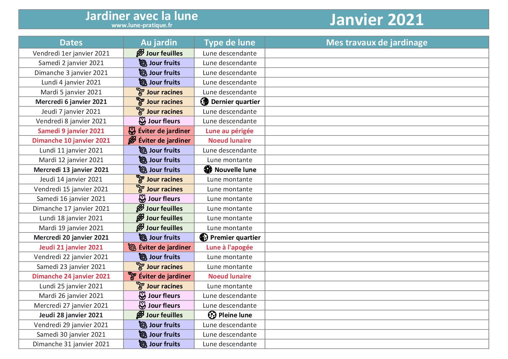Calendrier lunaire de janvier 2021 pour le jardin à imprimer
